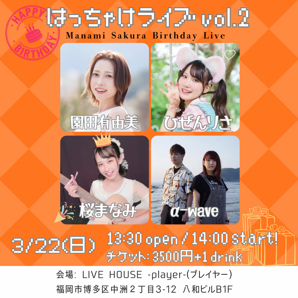 はっちゃけライブ vol.2 スケジュール🗒️ 2026/03/23(月) 14:00 - プレイヤー 地図を表示 2026年3月22(日) 「はっちゃけライブ vol.2」 桜まなみの生誕ライブを開催します! 昨年も生誕ライブに出演していただきました、 α-waveさん✨ そして、今回は佐賀を拠点に活動中の だーゆんさんとひぜんりささんが初出演❣️ コラボタイムもおたのしみにーーっ!! URLをコピーする 報告する
